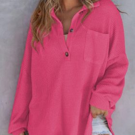 This waffle knit top is made from a solid color material, providing a simple yet elegant look. The button-up design adds a unique touch to this versatile piece. The boyfriend-style design of this lady’s tunic ensures a loose and comfortable fit.